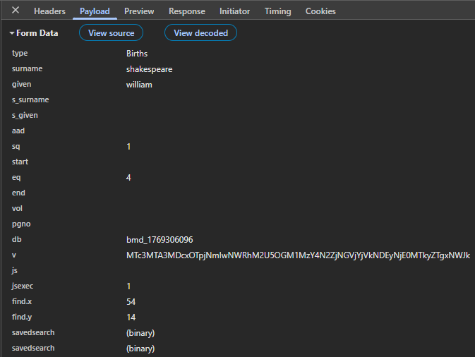 To see what the form actually sends, I searched for “William Shakespeare” (a 19th‑century one, not the bard). The POST variables look like this: