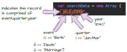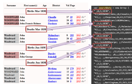 - There’s some JavaScript validation to prevent obviously impossible searches (e.g., “Find Grandma who died in 2014” when the dataset ends in 2000).